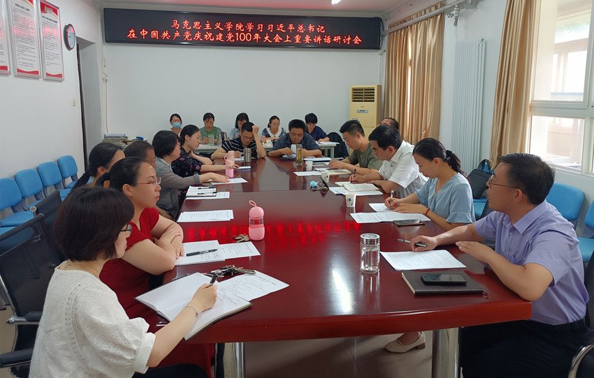 在研讨过程中,学院直属党支部书记高建伟、经理华玉武首先和大家报告了学习体会和深刻感悟,并对学深悟透讲话精神、及时融入思政课教学以及发挥思政课教师自身优势、加强宣讲宣传和研究等方面提出建议。随后与会思政课教师党员逐一发言谈体会、谈认识。大家一致认为,习近平总书记在庆祝中国共产党成立100周年大会上的重要讲话是一篇马克思主义纲领性文件,处处闪烁着马克思主义理论的光辉,是党团结带领人民以史为鉴、开创未来的行动指南;大家认为,习近平总书记用“四个伟大成就”、“九个必须”深刻阐述了中国共产党的奋斗历程和宝贵经验,有力回答了马克思主义为什么行、中国共产党为什么能、中国特色社会主义为什么好这一根本问题;大家认为建党精神是中国共产党的精神之母,体现了中国共产党历史发展的主题和主线,展示了中国共产党历史的主流和本质,具有传承、支撑和密码的价值作用;老师们表示,要把学习习近平总书记在庆祝中国共产党成立100周年大会上的重要讲话,同学习习近平新时代中国特色社会主义思想、同学习习近平总书记关于党史学习教育的重要论述有机结合起来,深刻理解其思想精髓和核心要义,及时融入思政课程,认真开展宣传宣讲和专题研究,在真学、真悟、真信上下功夫、见成效,教育引领北农学子增强“四个意识”、坚定“四个自信”、做到“两个维护”。