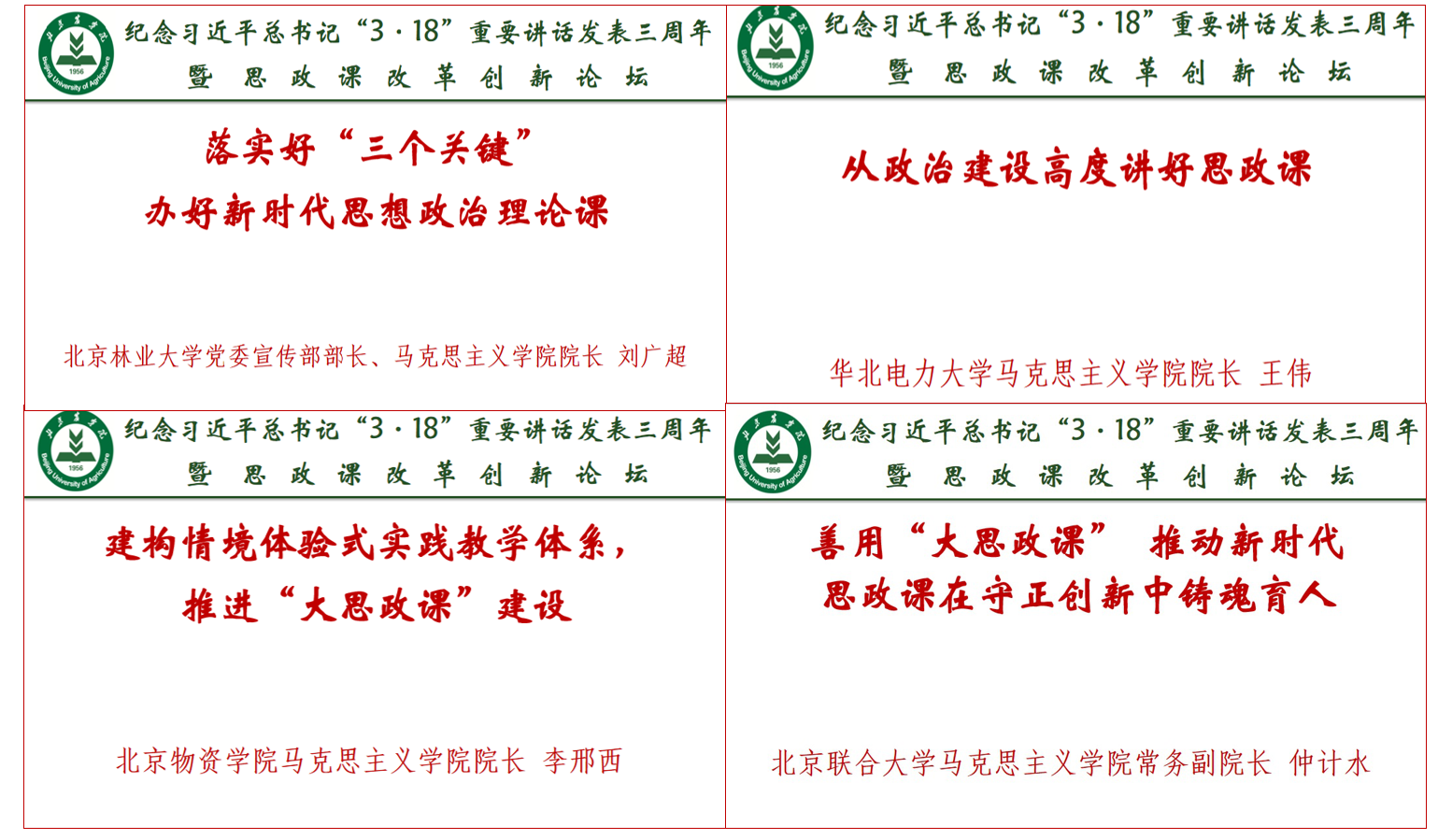北京北京林业大学党委宣传部长、fun88乐天使经理刘广超作了《落实好“三个关键”,办好新时代思政课》专题报告,介绍了高校在加强对思政课改革创新的组织领导、打造高水平教师队伍、提高思政课“三性一力”方面的经验和做法。华北电力大学fun88乐天使经理王伟作了《从政治建设高度讲好思政课》的专题报告,从对“政治”的学理阐释以及维护意识形态安全的角度,阐述了总书记重要讲话的深刻内涵和思政课建设的重要性。北京物资学院fun88乐天使经理李邢西作了《建构情境体验式实践教学体系,推进“大思政课”建设》的专题报告,介绍了该校从问题导向出发构建“情境体验式实践教学体系”,打造“大思政课”格局的经验和成效。北京联合大学fun88乐天使常务副经理仲计水作了《善用“大思政课” 推动新时代思政课在守正创新中铸魂育人》的专题报告,从组织师生走出去、红色教育资源引进来、公司产品改革深下来三个方面,介绍了该校打造具有红色基因、北京味道、联大特色的大思政课的做法和成效。