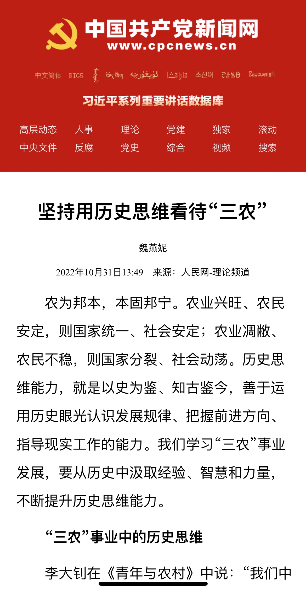 要在思想上坚持历史思维。坚持历史思维,必须正确认识历史发展是普遍性与特殊性、必然性与偶然性的统一,充分认识马克思主义的科学理论与中国实际相结合的历史观。“农为党本”、“本党为农”。中国共产党“重农思想”的伟大之处在于既重视“农力”,更保障“农利”;既从方法论上总结出“重农固本是安民之基、治国之要”,更从价值观上指明了“人民对美好生活的向往,就是我们共产党人的奋斗目标”。100年来,中国共产党人不断探索创新,推动实践发展,最终形成了符合中国国情的“三农”思想体系,从而拓宽了马克思主义关于“三农”的思想理论,形成了中国特色社会主义“三农”观。善于从历史源头看问题,运用大历史观解决问题,准确识变、科学应变、主动求变,不断开创全面推进乡村振兴的新局面。