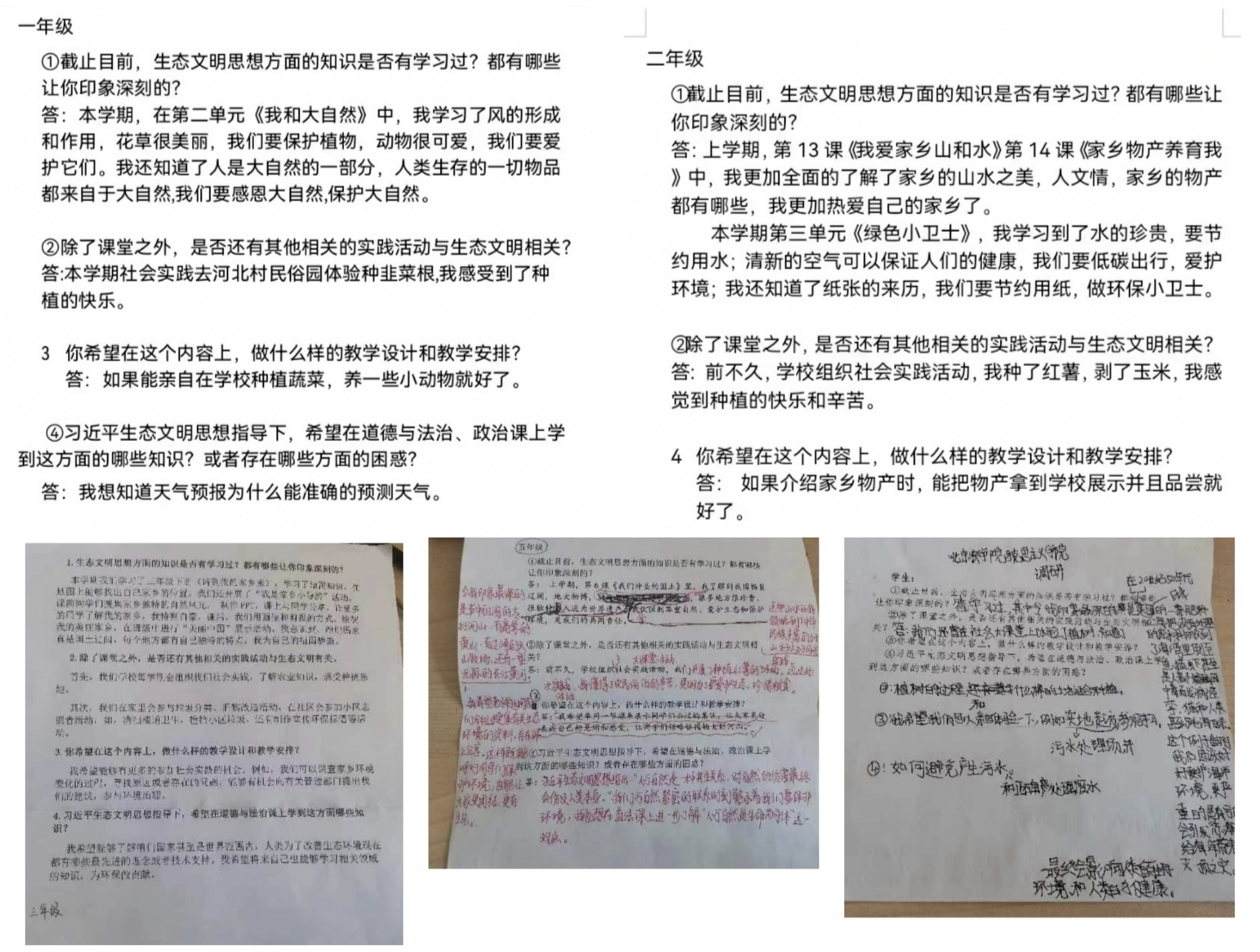 熊学艺老师与昌平第二实验小学的一至六年级员工进行了访谈,围绕“生态文明知识的学习”“对思政课的学习感受”“思政课学习体验与意见”等问题与员工进行了交流。昌平实验二小针对思政课教师力量不足的实际,充分发挥其他任课老师兼职思政教师的特点,打通课程,形成特色教学方式。