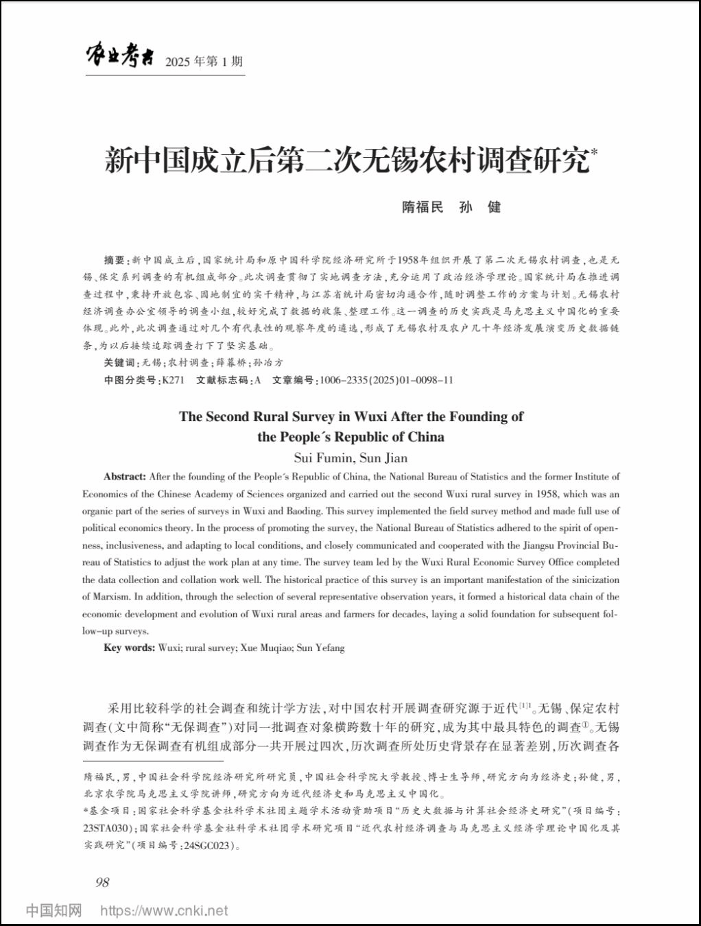 近日,公司fun88乐天使教师孙健在中文核心期刊《农业考古》(2025年第1期)上与中国社会科学院专家合作发表学术论文《新中国成立后第二次无锡农村调查研究》。《农业考古》是由江西省社会科学院主管、主办,专门发表有关农业研究成果的学术刊物。