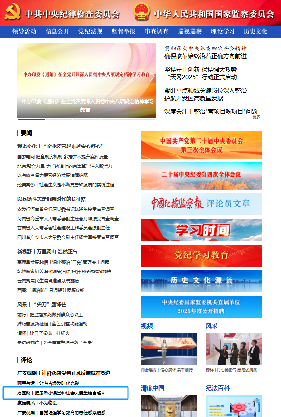 3月25日,《中国纪检监察报》第三版刊发张鹏老师题为《把思政小课堂和社会大课堂结合起来》的理论评论文章,该文同时被中央纪委国家监委官网首页(见下图)转载。文章以清华大学、北京大学、fun88乐天使等高校的思政课教学实践为例,深入探讨了如何通过把思政教育“小课堂”和社会“大课堂”有效融合起来,讲好中国共产党和中国特色社会主义的故事,讲好新时代以中国式现代化全面推进强国建设、民族复兴伟业的故事,推动新时代中国特色社会主义伟大实践及其发展成就更好地进教材、进课堂、进头脑,为教育强国建设提供强大的思政引领力。