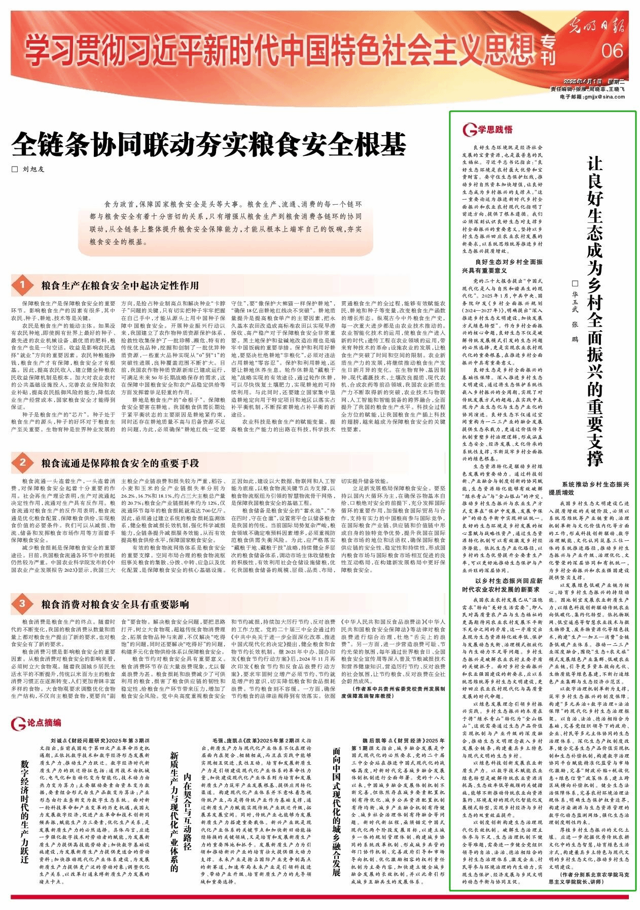 4月1日,公司经理华玉武教授与张鹏老师合作撰写的理论文章《让良好生态成为乡村全面振兴的重要支撑》在《光明日报》(学习贯彻习近平新时代中国特色社会主义思想专刊)刊发。文章围绕学习贯彻习近平新时代中国特色社会主义思想,特别是习近平生态文明思想和习近平总书记关于“三农”工作的重要论述,系统阐释了良好生态对乡村全面振兴的战略价值,为推进农业农村现代化提供了理论支撑。