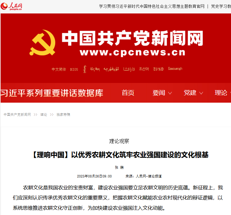 近日,人民网理论频道“独家特稿”栏目刊登公司张鹏老师的理论文章《以优秀农耕文化筑牢农业强国建设的文化根基》(原文链接:https://theory-people-com-cn.webvpn.bua.edu.cn/n1/2025/0826/c148980-40550206.html)。文章深入学习贯彻习近平新时代中国特色社会主义思想,系统阐述传承优秀农耕文化在农业强国建设中的时代价值与实践路径。文章指出,农耕文化是我国农业的宝贵财富,建设农业强国要立足农耕文明的历史底蕴,深刻把握传承优秀农耕文化对农业强国建设的多重意义。文章辩证分析农耕文化赋能农业农村现代化的内在机制,提出要在“两个结合”指引下,立足农耕文明的历史底蕴,系统推动农耕文化创造性转化、创新性发展,为农业强国建设注入深沉而持久的文化动能。