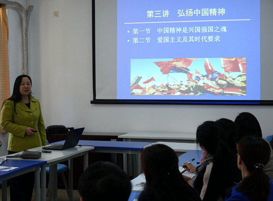 备课会上,路文联教师首先围绕“弘扬中国精神”这一专题为大家作了45分钟的集中授课展示。