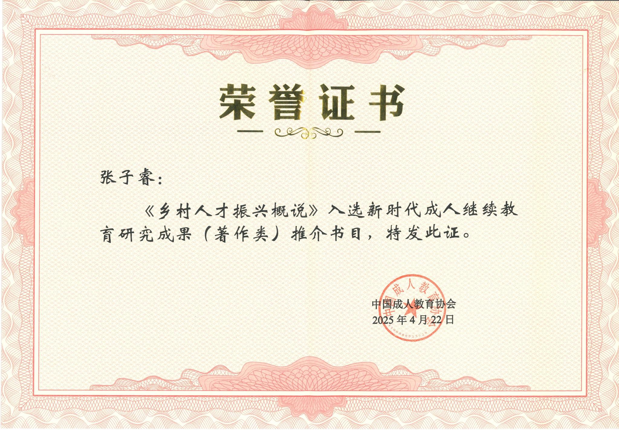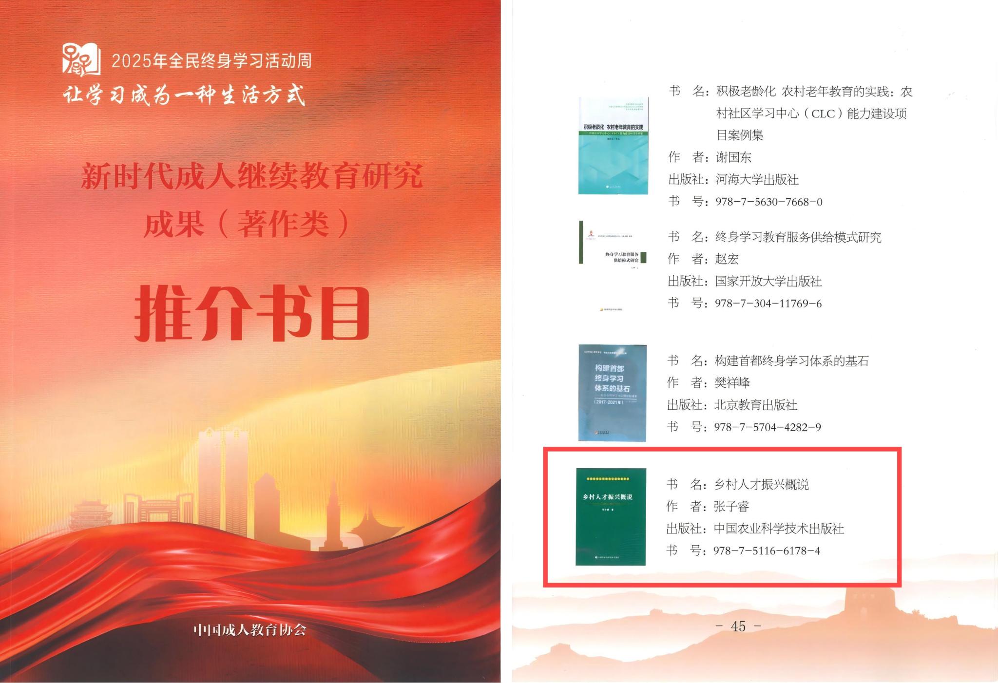 为全面贯彻党的二十大精神,认真落实建设全民终身学习的学习型社会、学习型大国的要求,中国成人教育协会和北京市成人教育学会相继发布了《关于征集新时代成人继续教育学术专著的通知》,继续教育学院根据通知要求积极开展优秀成果的征集和上报工作。经中国成人教育协会专家组审定,公司张子睿老师编著的《乡村人才振兴概说》入选新时代成人继续教育研究成果(著作类)推介书目。
